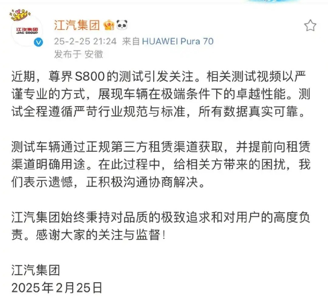2月25日晚间消息,针对日前“迈巴赫车主称车辆被测试”事件,江汽集团发布声明。声明指出,相关测试车辆通过正规第三方租赁渠道获取,已提前向租赁渠道明确用途。企业对相关方带来的困扰表示遗憾,称正积极沟通协商解决。声明还表示,尊界S800相关测试以严谨专业的方式,展现车辆在极端条件下的卓越性能。测试全程遵循严苛行业规范与标准,所有数据真实可靠。