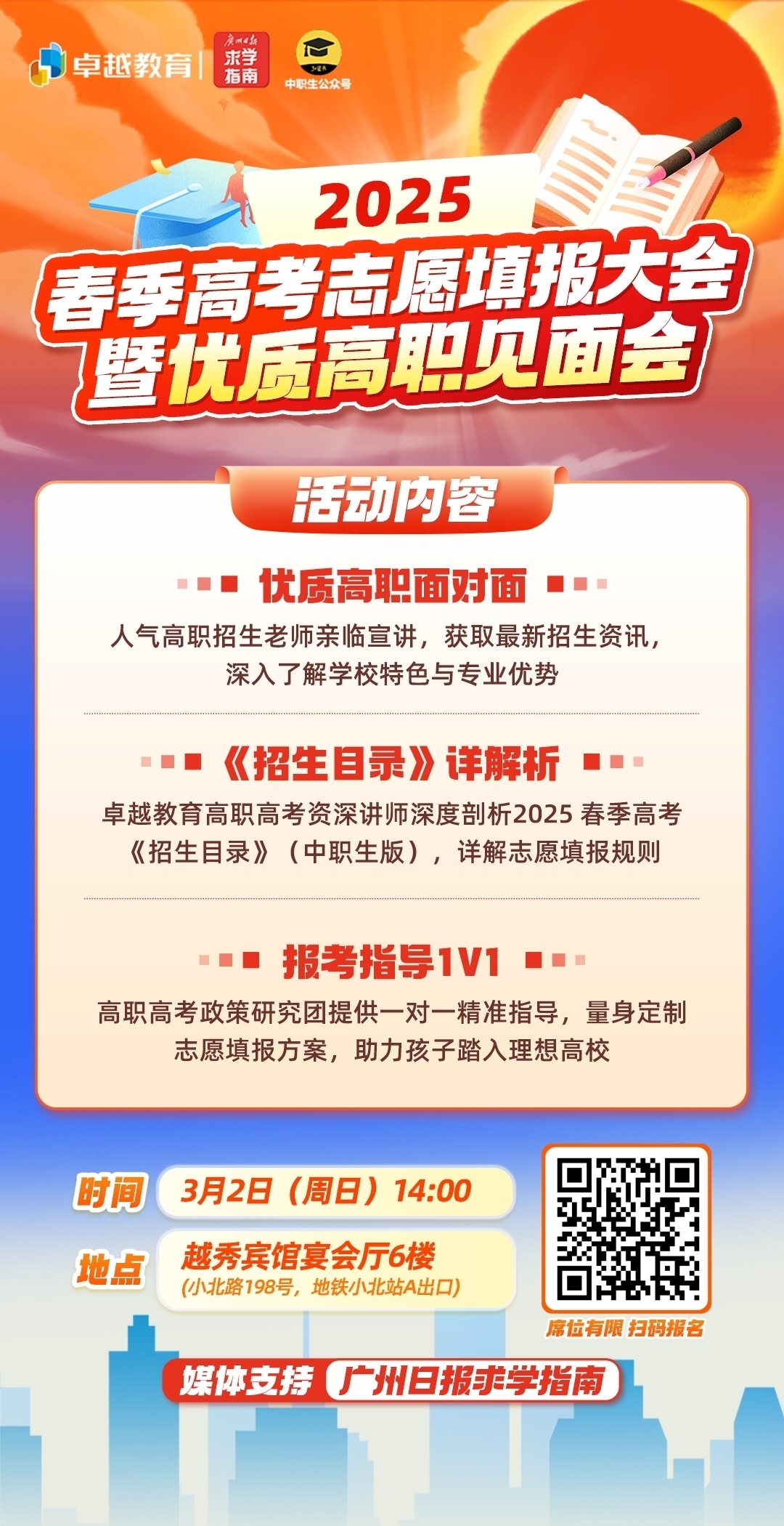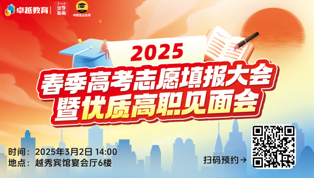 3月2日(周日)14:00,卓越教育联合广州日报求学指南、中职生公众号,邀请多位卓越教育高职高考政策研究员和多所省内人气高职院校,共同举办“卓越教育公益活动丨2025年春季高考志愿填报大会暨优质高职见面会”,助力考生步入理想院校!