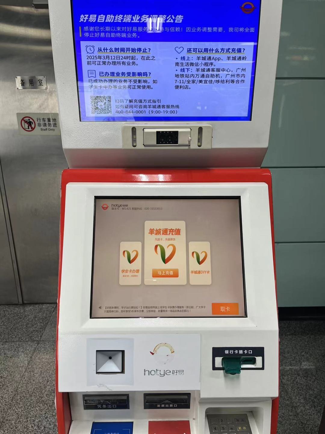 好易自助终端中包括羊城通充值服务。在业务停止后,市民可通过其他渠道办理羊城通卡余额查询和充值等相关业务。