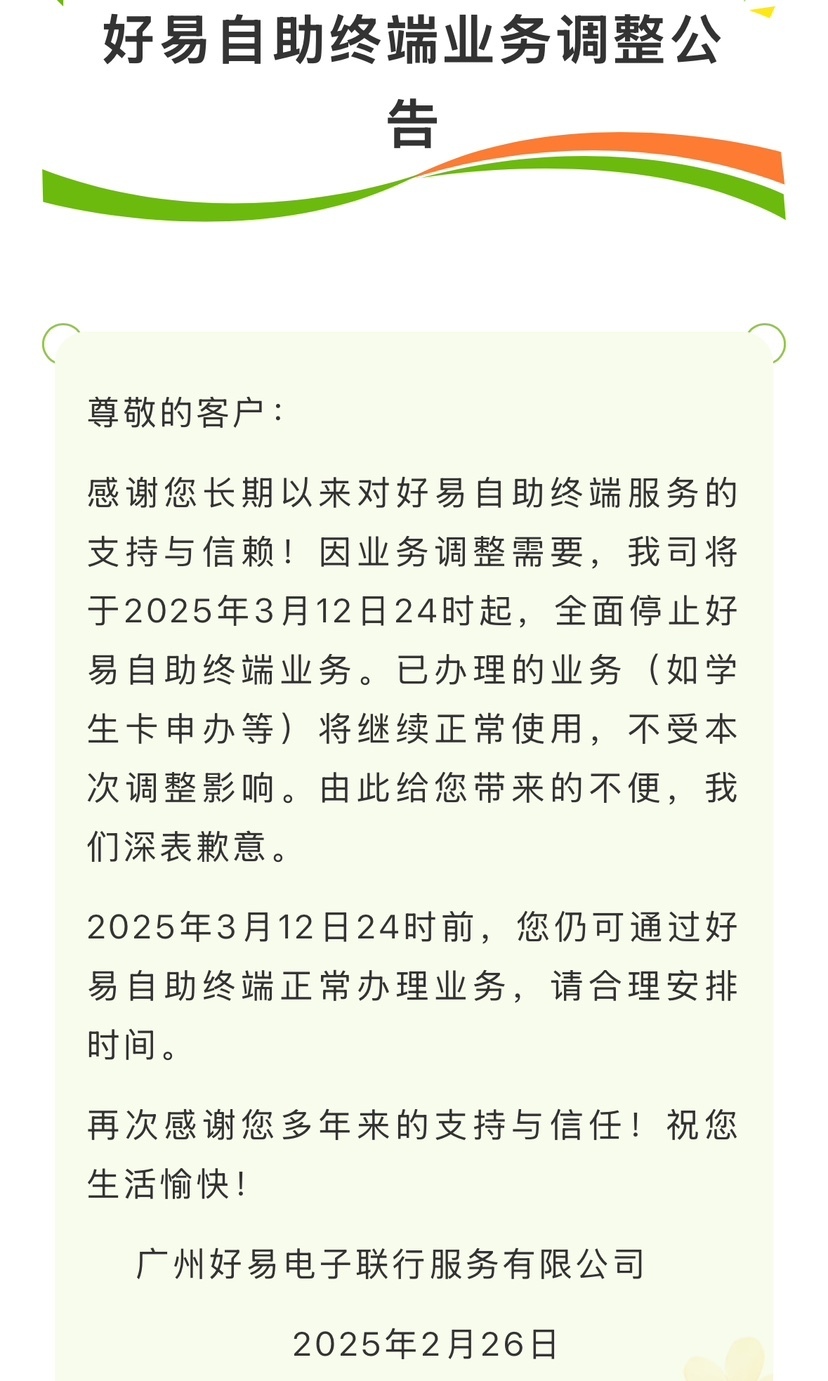 26日,广州好易电子联行服务有限公司发布关于好易自助终端业务调整公告。其中提到,因业务调整需要,将于2025年3月12日24时起,全面停止好易自助终端业务。已办理的业务(如学生卡申办等)将继续正常使用,不受本次调整影响。