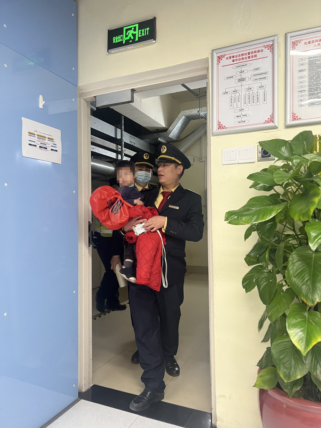 在车控室里,已为人父的唐续瑰和值班站长李灿锋化身临时“奶爸”,想着已到饭点怕小女孩肚子饿,他们拿出蛋饼等食物给她吃,可认生的小女孩什么也不肯吃,只是安安静静地坐在凳子上不哭也不闹。本想从小女孩身上获得家人的有关信息,无奈年纪太小表达不清,唐续瑰和李灿锋只好另想办法。考虑到A口附近是水南村,小女孩很可能自行从家里出来没被发现,于是他们马上联系水南村村委帮忙寻找。正在众人绞尽脑汁扩大寻找范围时,附近地产物业的工作人员来到车站询问是否有“捡到”一名小女孩。经了解,他们受所在小区一个商铺的主人张女士求助,也在全力寻找走丢的孩子。让人欣喜的是,经过辨认,“流落”到太平站的女孩正是张女士寻找的孩子。随后,心急如焚张女士接到“找回孩子”的好消息后立即赶到车站。