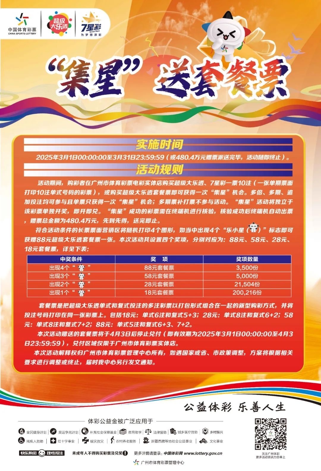 3月春风拂面,好运来袭,喜事临门。3月1日至31日期间,广州体彩隆重推出“集星”送套餐票活动,这不仅是一次购彩的盛宴,更是一场幸运与欢乐的派对。