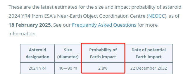 为了及时向社会公布观测数据,NASA和欧洲空间局(ESA)建立了专门的网页,每天更新风险评估,比如1月29日撞击概率为1.3%,2月7日为2.2%,2月15日为2%,2月18日为2.8%,2月19日为3.1%等。