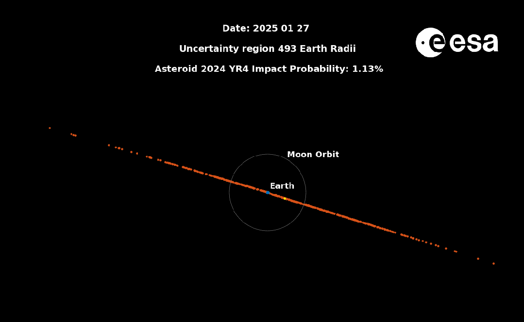 图说:2024 YR4的风险走廊演变,使用了截至2025年2月20日的观测数据。每个红点代表小行星在2032年12月22日可能的位置。黄点代表最符合现有观测数据的位置。图源:欧洲空间局官网
