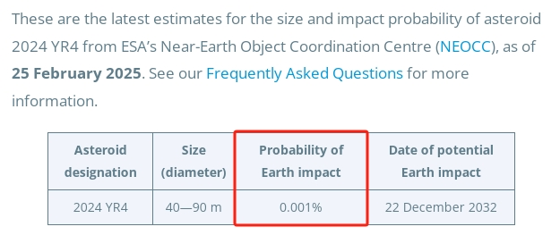在大家忙着为未来做打算时,撞击概率又逐渐下降,截至2月25日数据,撞击概率已滑落到0.001%。
