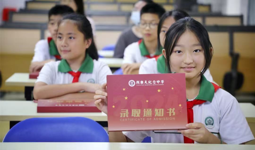 新科小学的学生领取颜乐天纪念中学的录取通知书