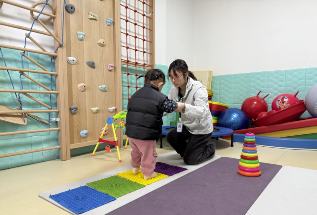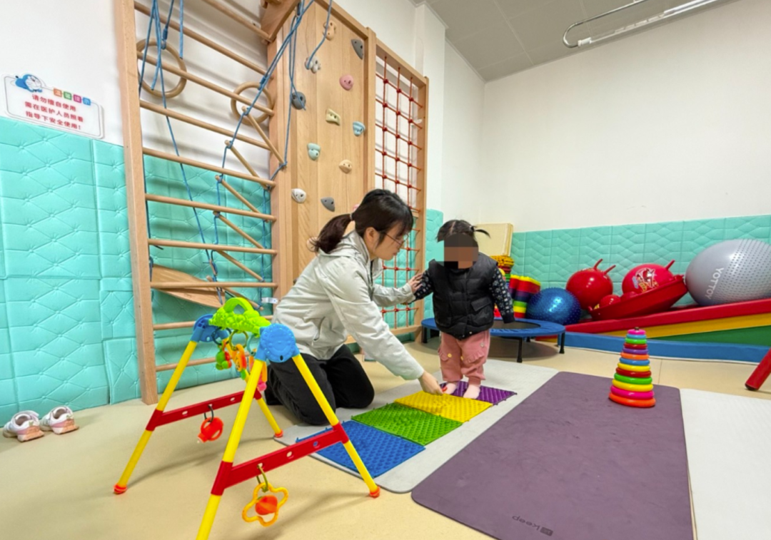 在石门街社区卫生服务中心感统治疗室内,孤独症孩子彤彤(化名)正在进行行为干预训练和感统训练,治疗师用手中的玩具去吸引彤彤的注意力,并通过控制声音的大小、做出夸张的表情等去引起彤彤的注意。