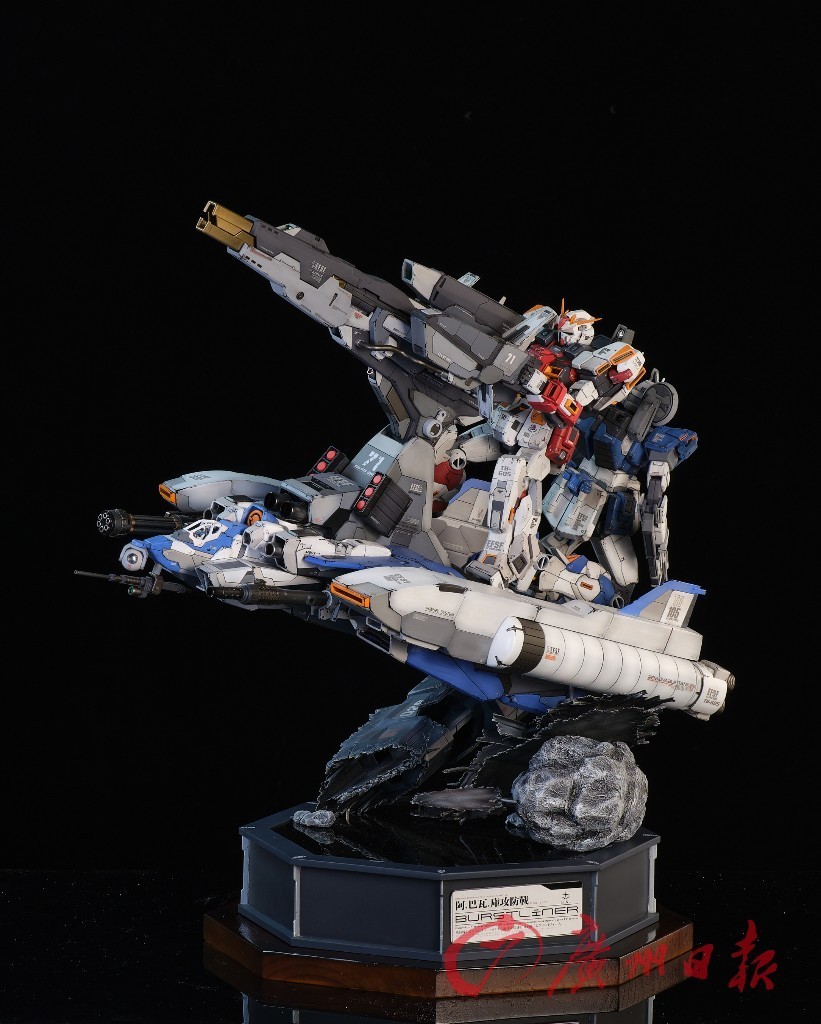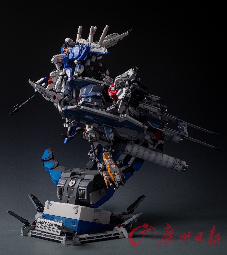 “这个作品高半米,结构复杂,工程量大,为了撑起庞大的机体,创新以不锈钢为支撑。”吴锦明告诉记者,作品前后花了5个月时间设计与制作,主题颇有意思:高达Ex-S握持武器,守护着正在维护飞行器的“墨镜机”耐罗,当Ex-S以为自己已掌握局面时,“死对头”MK-V已经锁定了他们。