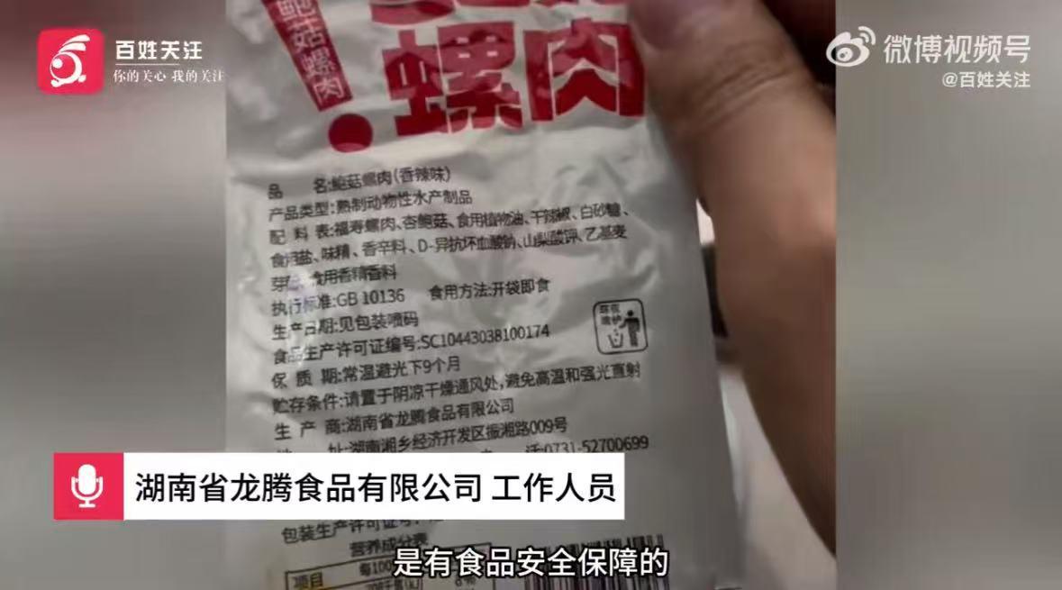 据贵州电视台百姓关注报道,2月26日,有市民发现“鲍零食菇螺肉”的配料表里第一配料为福寿螺肉,担心食用安全。该产品包装袋显示,该产品的生产商为湖南省龙腾食品有限公司,产地为湖南省湘潭市。