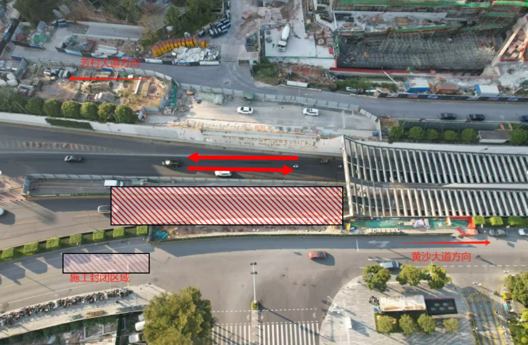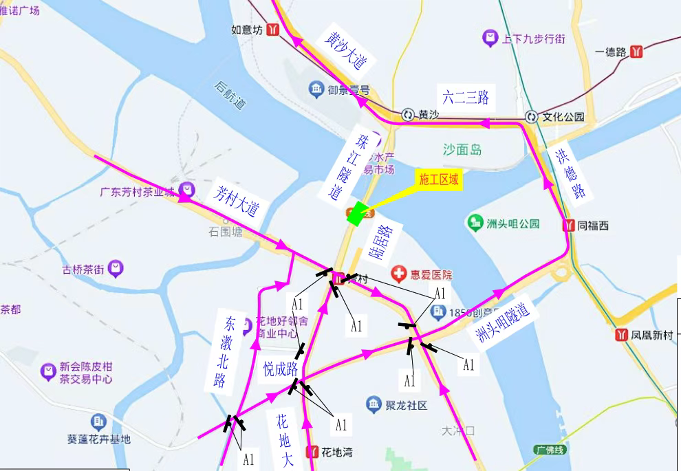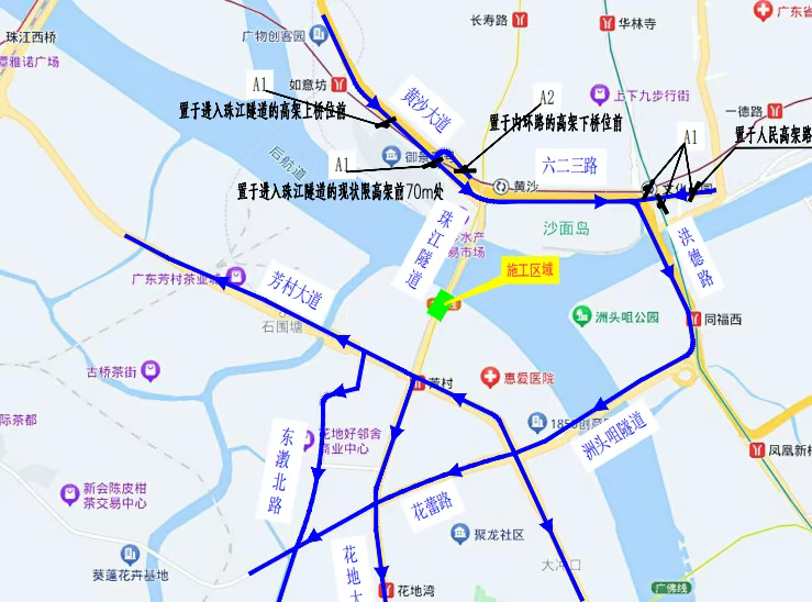 2025年3月3日至2025年3月18日,每天夜间22:00—次日早上6:00,北行车辆(往黄沙大道方向)可绕道芳村大道—洲头咀隧道—洪德路—六二三路通行,南行车辆(往芳村大道方向)可绕道六二三路—洪德路—洲头咀隧道—花蕾路通行。交通疏导图如下: