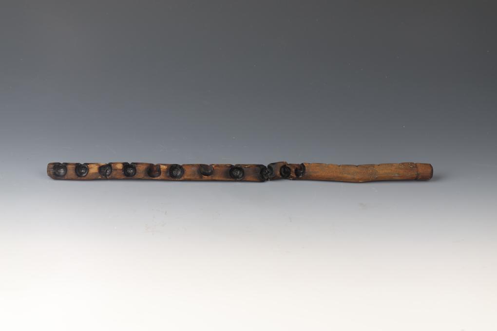 在草堰港遗址,考古人员已发现多件钻木取火器。本次出土的这件取火器由钻杆和取火板两部分组成,钻杆长60多厘米,取火板长30多厘米,整体呈棕褐色,其表面有10余个深黑色的圆形凹窝,并带有明显灼烧痕迹。