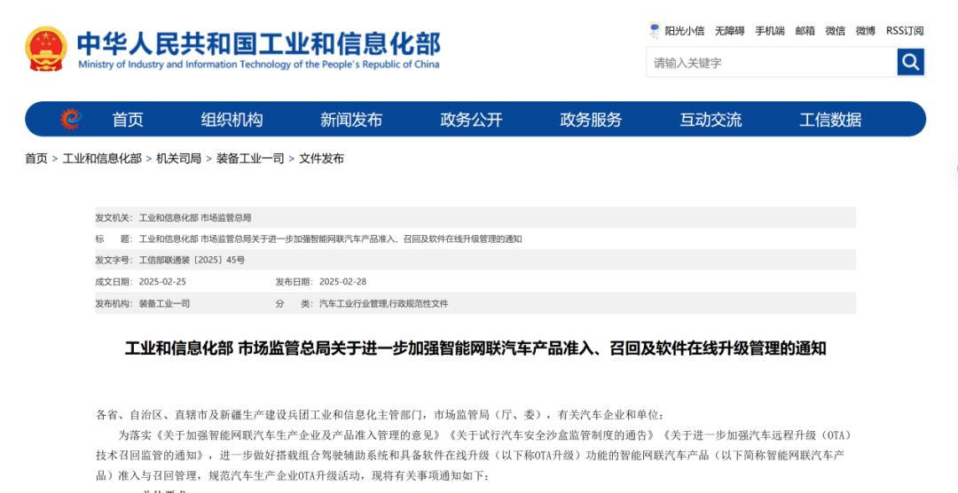 2025年2月28日,工信部联合市场监管总局发布了《关于进一步加强智能网联汽车产品准入、召回及软件在线升级管理的通知》(以下简称《通知》),对强化智能网联汽车研产销用环节进行了规范和要求。