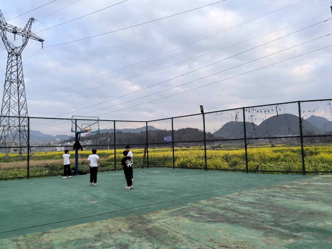 随着放学铃声的响起,孩子们欢快地奔向文化广场,三五成群,或追逐嬉戏,或挥洒汗水,欢声笑语回荡在乡间小道里。不远处,篮球场上热闹非凡。传球、投篮、喝彩声此起彼伏,青春的热力与油菜花的生机在春风中交织。篮球场边上,一条碧道正在建设中,工人们忙碌地铺设地砖,栽种绿植,未来,这里将成为村民们散步、健身的新去处。