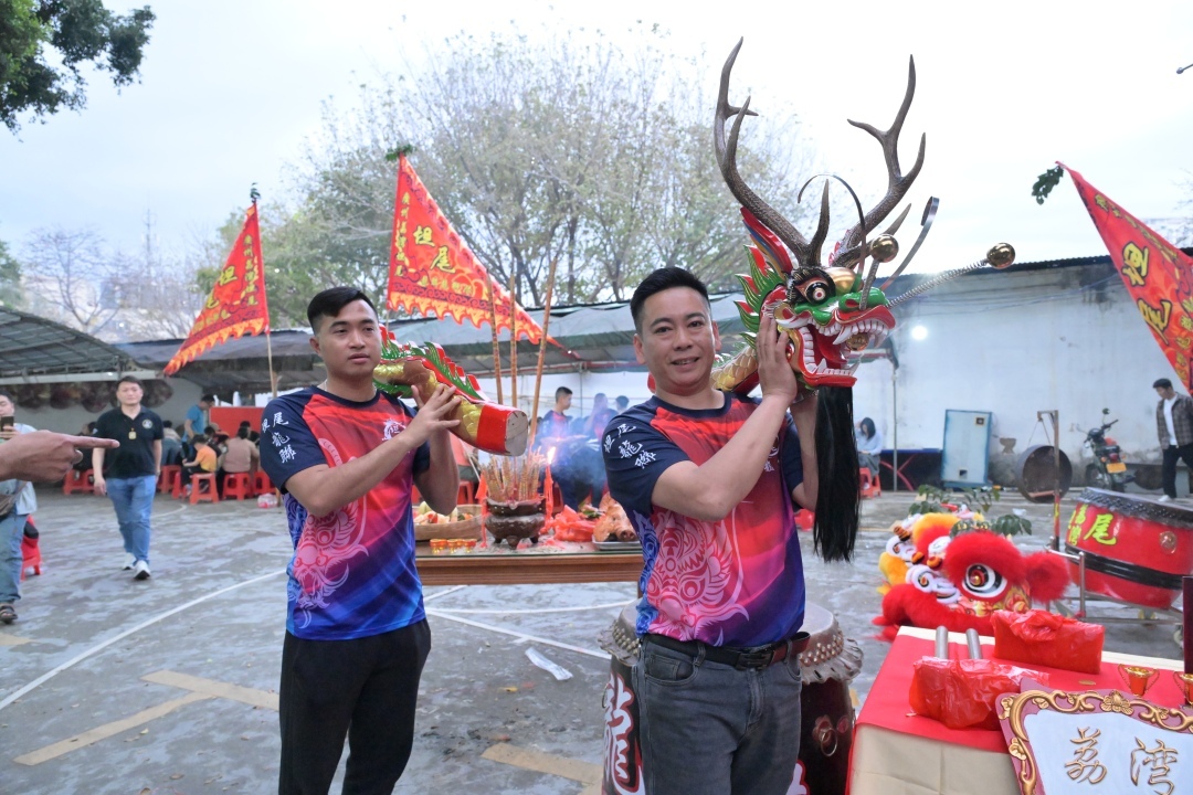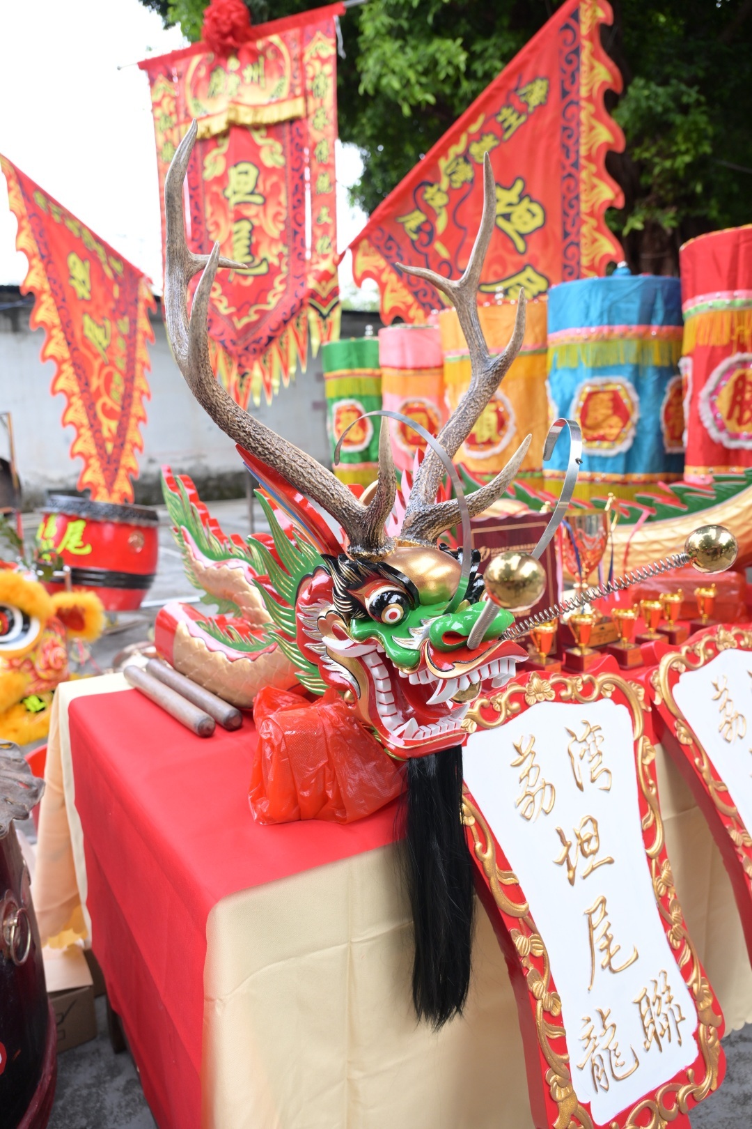 3月1日下午4时许,海角路坦尾龙联队活动点门口,一红、一黄两只醒狮头吸引眼球,两个崭新的标准龙、传统龙龙头放在入口处案上,一旁龙船旗、龙船牌、龙船桡、罗伞摆放得整整齐齐。陆续有村民前来,互道一声“精神”,随后争相与醒狮头、龙船头合影,现场喜气洋洋。