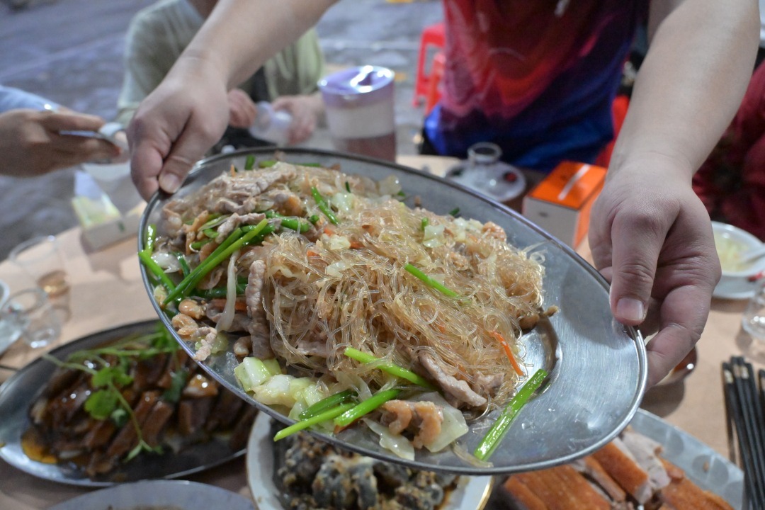 最后,坦尾村民以颇具特色的菜式招待乡亲,包括坦尾走地鸡(寓意“一鸣惊人”)、大姨妈嫁女(粉丝烩虾米,寓意“白头到老”“长长久久”)、龙船丁(寓意“添丁”)、坦尾自制咸酸蒸鹅等特色菜式,乡亲们在传统围餐中共叙乡情。