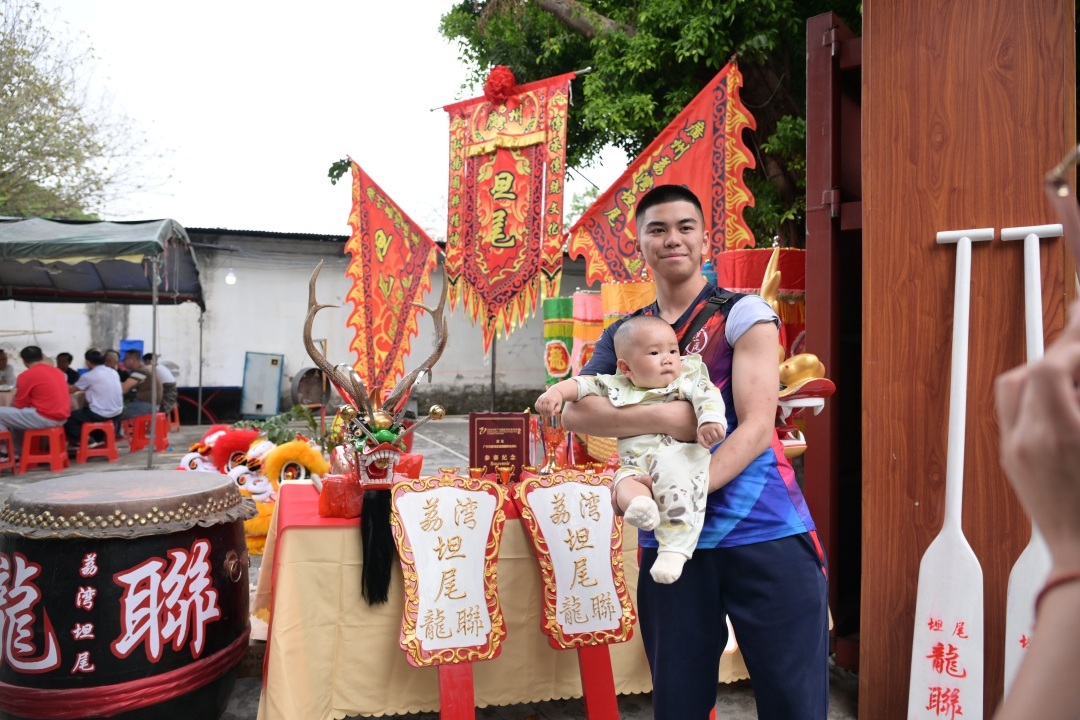 当天也是坦尾龙联龙狮队正式宣告成立的好日子,荔湾泮塘村、东漖村,黄埔沙浦村以及来自佛山南海、盐步的友好村前来道贺。广州龙舟文化历史悠久、源远流长,坦尾龙联龙舟队2022年组建之后,经过不断的训练和兄弟老表村的盛情邀请,得以见识学习各村传统文化特色、提升龙舟竞技水平,取得了2023年广州市国际龙舟赛彩龙游龙组第二名及香港荃湾国际龙舟邀请赛第四名的好成绩。“上世纪70年代,我们村曾有两条龙船,但后来年久失修。在村龙联龙舟队成立后,我们打造了一条10人玻璃钢标准龙,现正在打造一条22人玻璃钢标准龙以及长40.03米的坤甸木传统长龙。在父老乡亲、各界人士的同心协力下,力争将今年的龙舟活动进行得有声有色。”原志坚说。