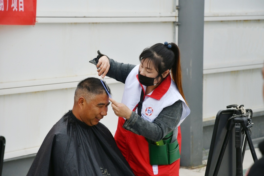 上午9点多,工友们陆续到达活动现场,志愿者组织大家排队等候,按照顺序依次理发。“帮我把头发下面修一修就行。”“麻烦帮我头发剪短点,要精神一点的。”……询问完工友们的意见,义剪志愿者们全神贯注,剪刀、推子、梳子等工具在手中灵活舞动,他们动作娴熟流畅,又不失耐心细致。工友们看着自己的新发型,纷纷称赞理发师的手艺。