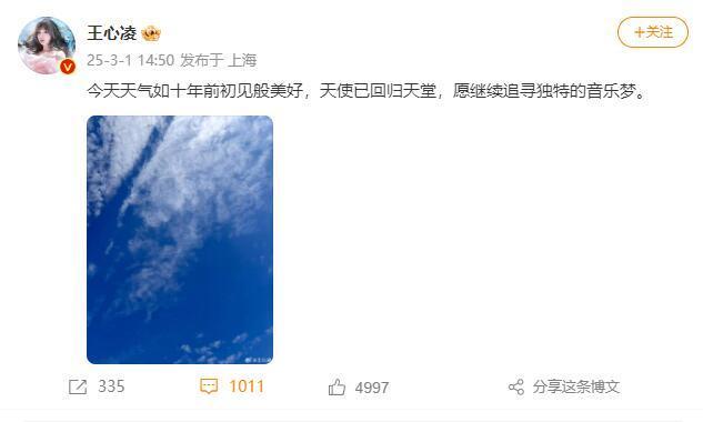 王心凌发文表示,今天天气如十年前初见般美好,天使已回归天堂,愿继续追寻独特的音乐梦。两人曾合作《天使的偏执》,收录于王心凌第十张专辑当中,由藤井树作词,方大同作曲。