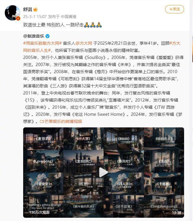3月1日中午,赋音乐FUMUSIC官方账号发文称,著名流行歌手方大同于2月21日早晨去世,年仅41岁。