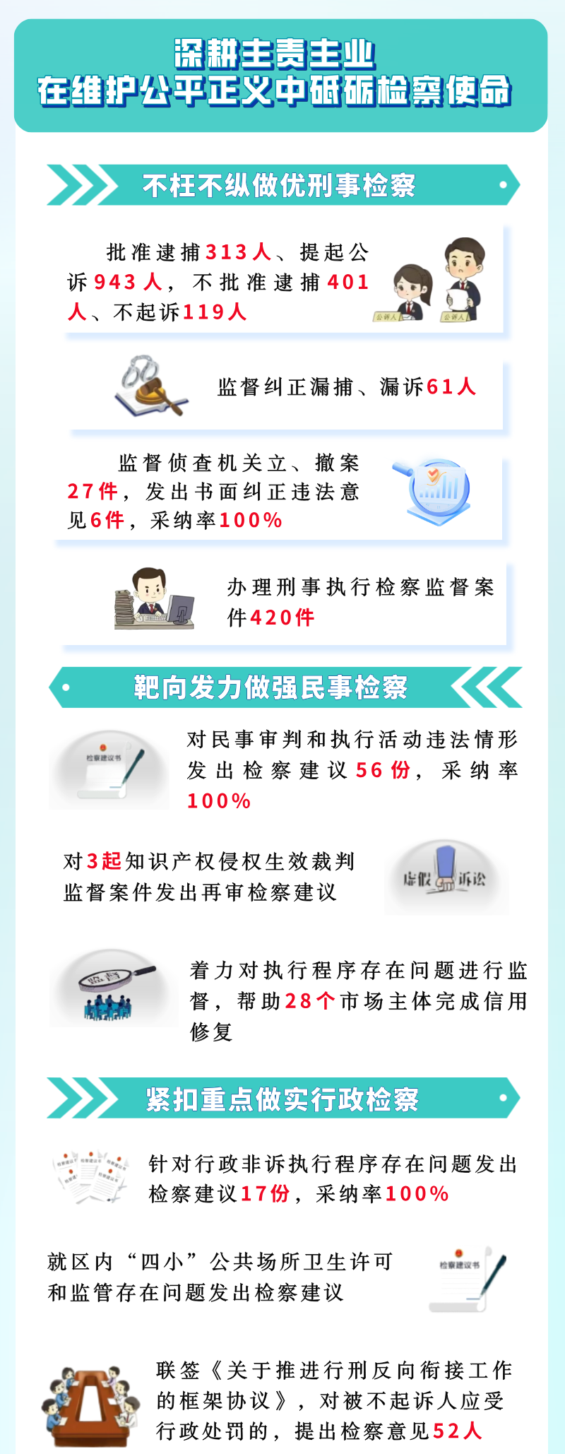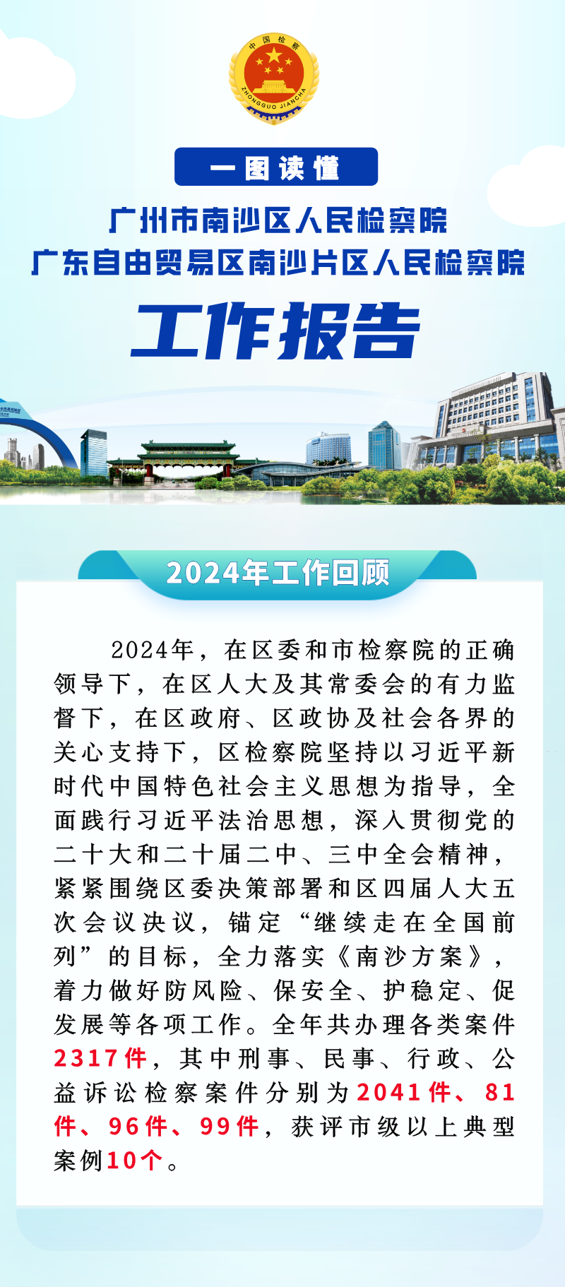 2024年,在区委和市检察院的正确领导下,在区人大及其常委会的有力监督下,在区政府、区政协及社会各界的关心支持下,区检察院坚持以习近平新时代中国特色社会主义思想为指导,全面践行习近平法治思想,深入贯彻党的二十大和二十届二中、三中全会精神,紧紧围绕区委决策部署和区四届人大五次会议决议,锚定“继续走在全国前列”的目标,全力落实《南沙方案》,着力做好防风险、保安全、护稳定、促发展等各项工作。全年共办理“四大检察”各类案件2317件,获评市级以上典型案例10个,13个集体和42名个人获区级以上表彰。