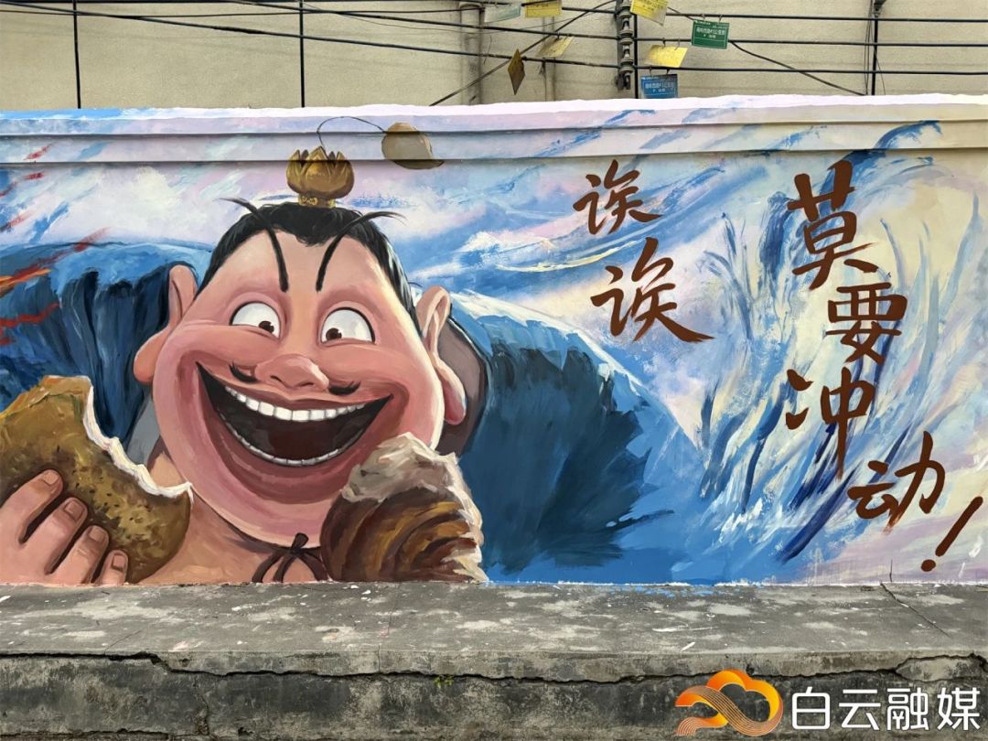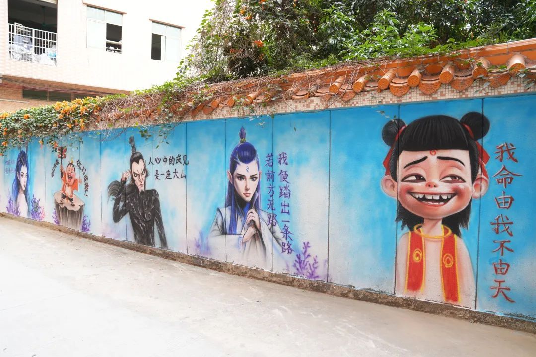 In Nanling Village, situated on Longgui Sub-district in Baiyun District, a 30-meter-long wall has undergone a remarkable transformation, now featuring a breathtaking graffiti mural themed around Ne Zha. This vibrant artwork meticulously depicts a host of characters, including Ne Zha, Ao Bing, Lady Yin, the Groundhog, Shen Gongbao, and Wuliang Xianweng, each rendered in stunning detail.
