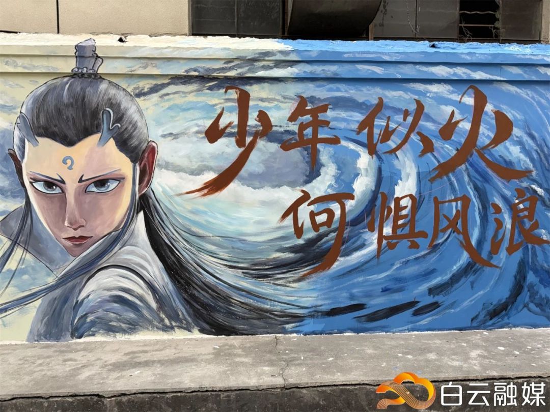 A colossal Ne Zha-themed graffiti mural, standing 2 meters in height and sprawling 10 meters in width, has emerged on the wall of a community in Minzhi Subdistrict, Longhua District, capturing the attention of residents and visitors alike.