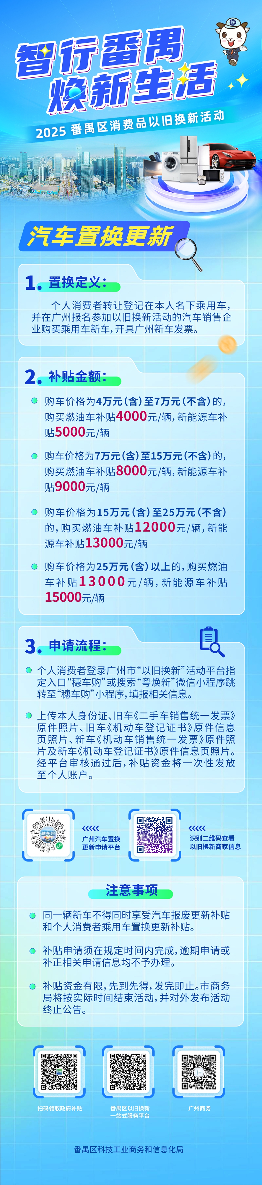 近日,广州推出置换汽车更新补贴政策,个人消费者转让名下乘用车并购买新车可享高额补贴!根据购车价格不同,燃油车补贴最高可达13000元/辆,新能源车补贴最高可达15000元/辆。消费者需通过“穗车购”小程序申请,补贴资金有限,先到先得,发完即止。本报制作长图解读车辆置换更新政策,并且整理番禺区汽车置换更新门店。快来了解详情,抓紧时间享受这一优惠政策吧!