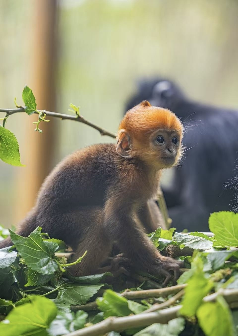黑叶猴是国家一级保护动物,也是濒危物种之一,它们喜欢吃树叶,全身皮肤乌黑光滑,两颊到耳侧有两抹白色绒毛,像“胡子”一样飘逸,而头顶上“竖起”的一簇毛发十分有辨识度。在“黑色调”的黑叶猴大家族中,披着金色毛发的小猴在阳光下格外耀眼,它就是家族最小的雄性幼崽“初一”。幼崽出生在蛇年正月初一,寓意添丁添喜,是名副其实的“福娃”。