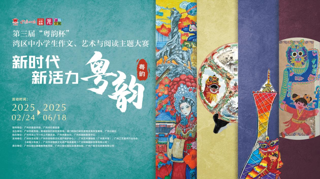 粤韵杯2025年湾区中小学生作文、艺术与阅读主题大赛由广州市委宣传部、广州市纪委监委指导,广州市教育局联合港澳两地教育主管部门以及广州日报社主办,广州市关心下一代工作委员会、广州市委台办、广州市国防教育中心协办,广州日报社健康教育新闻部、广州日报社国际及港澳台部、广州广报文化发展有限公司承办,广州市文化馆(广州市非物质文化遗产保护中心)、广州艺术博物院(广州美术馆)、广州工艺美术行业协会等文化、学术单位的联合支持。
