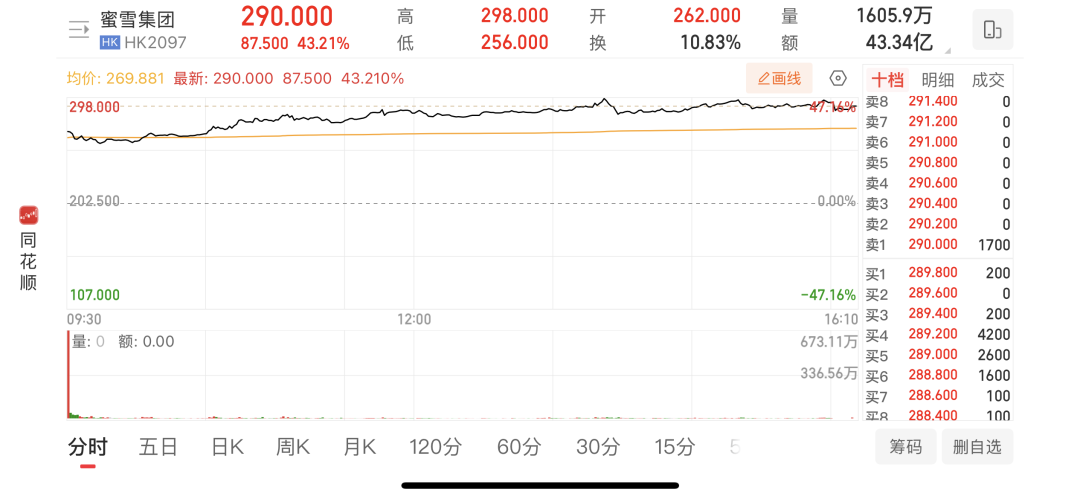 现制茶饮“上市即破发”的魔咒,被打破了!今日,蜜雪集团在港交所挂牌上市。每股发行价为202.50港元,开盘价为262.00港元/股,较发行价上涨29.38%。截至当日收盘,蜜雪集团报290港元/股,涨幅达43.21%,总市值达1093.5亿元。