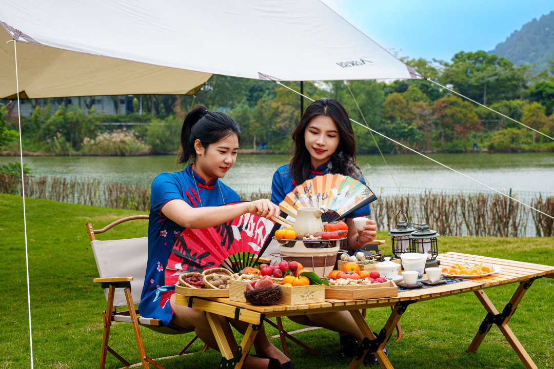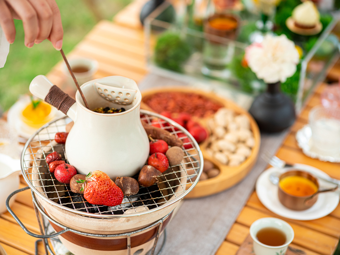 广州南沙花园酒店是与闺蜜相约围炉煮茶的好去处,在大大的草坪上,摆上炭烤炉具。果粒饱满的云南楚雄板栗,烤制后焦香粉糯,搭配小粒红皮花生、瓜子,果仁香气十足,再配上一口清爽绿茶,清爽解腻。将新疆的红枣,烤至外皮微微焦脆,咬上一口,里面的枣肉软糯香甜。