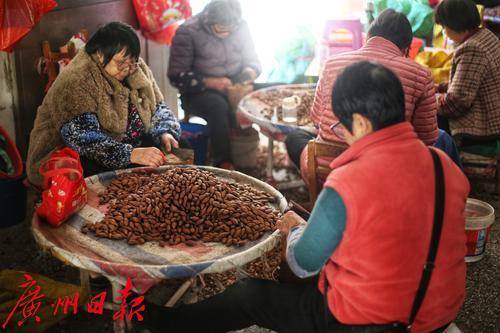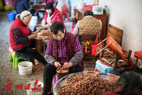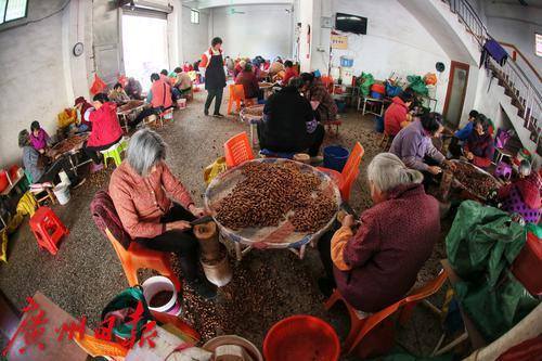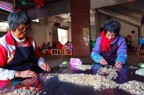 熟手的老婆婆们围坐一起敲榄核。