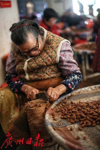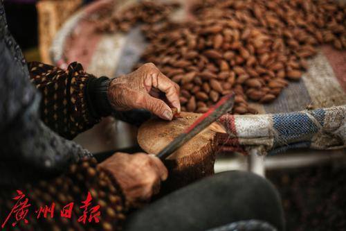 “哆、哆、哆”,此起彼伏的敲击声从增城石滩一间沿街屋宇中传出,几十位老婆婆散坐在房中,她们面前的竹斗笠中堆着两头尖尖的橄榄核。只见她们一手捏住橄榄核,一手用小刀熟练地敲击橄榄核中间,手起刀落,坚硬的榄核应声破开,露出了里面褐色的榄仁。