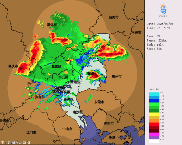 广州市气象台3月4日8时34分发布雷雨天气提示:受西北方向移近的强雷雨云团影响,预计未来3小时广州市越秀区、天河区有中到强雷雨,并伴有8级左右阵风和强雷电。从04日08时31分起,广州市越秀区、天河区雷雨大风黄色预警信号生效,后期不排除升级预警信号的可能性,请注意做好防御工作。
