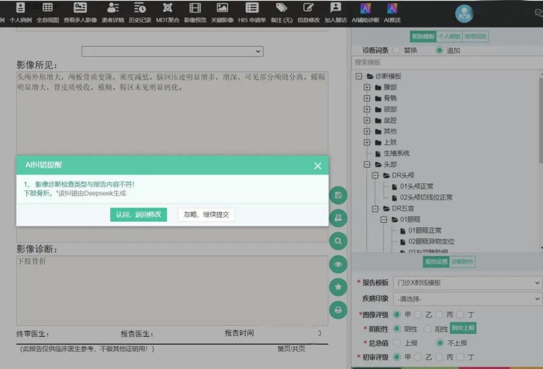 报告实时纠错应用以医疗知识图谱和动态诊疗规则库为支撑,在医生撰写报告过程中,可以进行实时纠错,让医疗安全防线从事后处理转为过程把控,从“经验医疗”到“算法医疗”,为患者提供了更为精准、更低风险的诊疗服务。