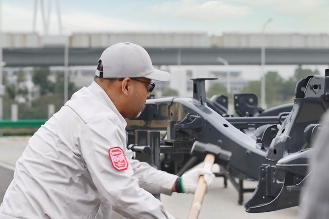 在“硬碰硬”环节,工作人员抡铁锤砸东风猛士917的车架,车辆展现出极强的抗冲击能力和坚不可摧的特性。在越野赛道体验环节,东风猛士917更顺利挑战八大硬核关卡。蟹形体验中,车辆凭借后轮线控转向技术,灵活避开障碍物,完成了特殊的“麋鹿挑战”;在0-100公里加速体验中,增程版车型三电机驱动,816匹马力使其6秒破百,展现出超级动力,5.1米的最小转弯半径也让它在桩桶间灵活穿行。面对40度侧坡、60cm交叉轴,车辆依靠强大的悬架系统和电子限滑技术轻松通过;搭载全球首个集成差速锁、两挡变速箱电驱总成的东风猛士917,成功征服100%陡坡,在爬坡体验环节震撼全场。涉水体验时,车辆以900mm的最大涉水深度远超国标300mm的要求,全地形适应能力十分出色。最后的“盲驾”过岩石路挑战,东风猛士917借助540°透明底盘技术,开启“上帝视角”从容应对。