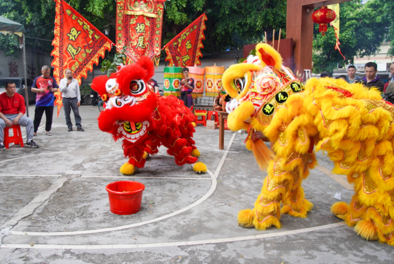 随着现场激昂的鼓点声响起,一红一黄两头醒狮腾跃欢舞,时而跳跃,时而摇头摆尾,惟妙惟肖的动作和神情吸引了村民的目光,人群里不时传出阵阵掌声和喝彩声,大家争相触摸狮头、狮身,以讨得好彩头。