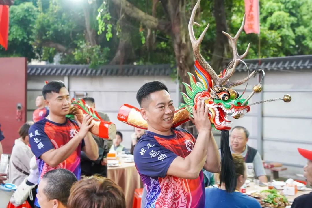 当天活动坦尾村还邀请了荔湾泮塘村、东漖村,黄埔沙浦村以及来自佛山南海、盐步等兄弟村的兄弟姊妹前来联谊助兴,各村村民齐聚一堂,品尝龙船饭,共诉乡情,席间村民还抬着龙头、龙尾巡游,作为另一种寓意的“龙抬头”,将现场气氛推向高潮。