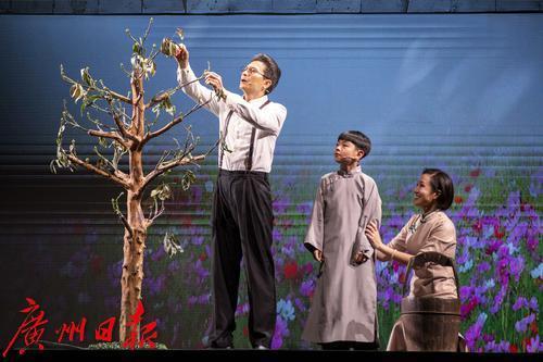 话剧《陈复》中,儿童陈复和父母一起种木棉树的场景。
