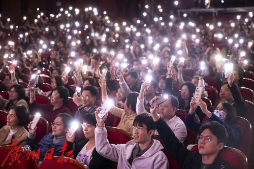观众打开手机闪光灯和舞台上的演员一起大合影。