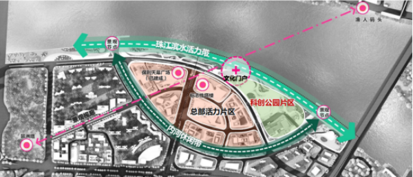 “两片区”:总部活力片区——依托“双带”周边既有产业,打造总部活力片区;科创公园片区——结合滨江绿地及新媒体数字产业园区公共开放空间,打造广州城市形象门户。