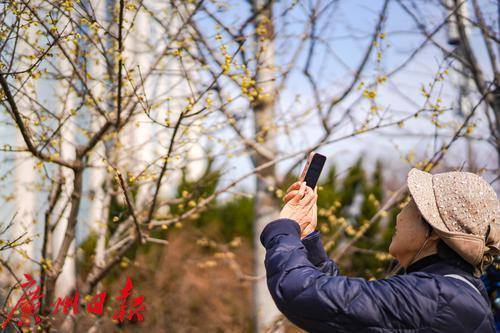 腊梅也正盛放,吸引市民拍照。腊梅花瓣姿态较为含蓄,但有一股幽香,行人走进便觉沁人心脾。