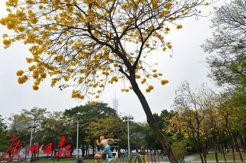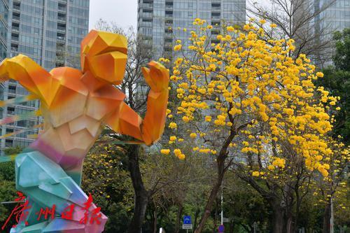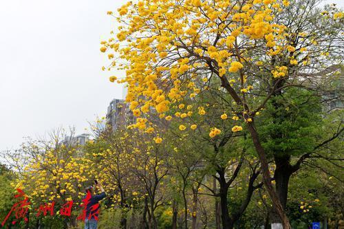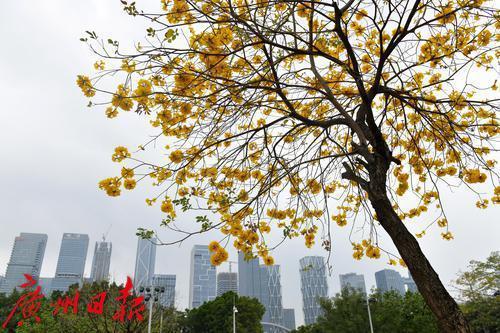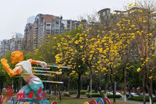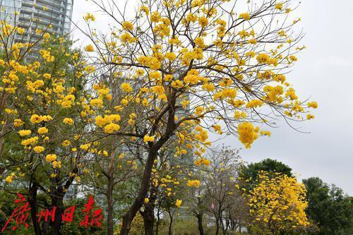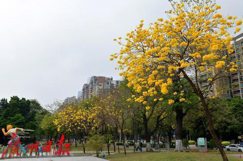天河区临江带状公园的黄花风铃木盛开,盛开的花朵娇艳多姿迎风摇曳。
