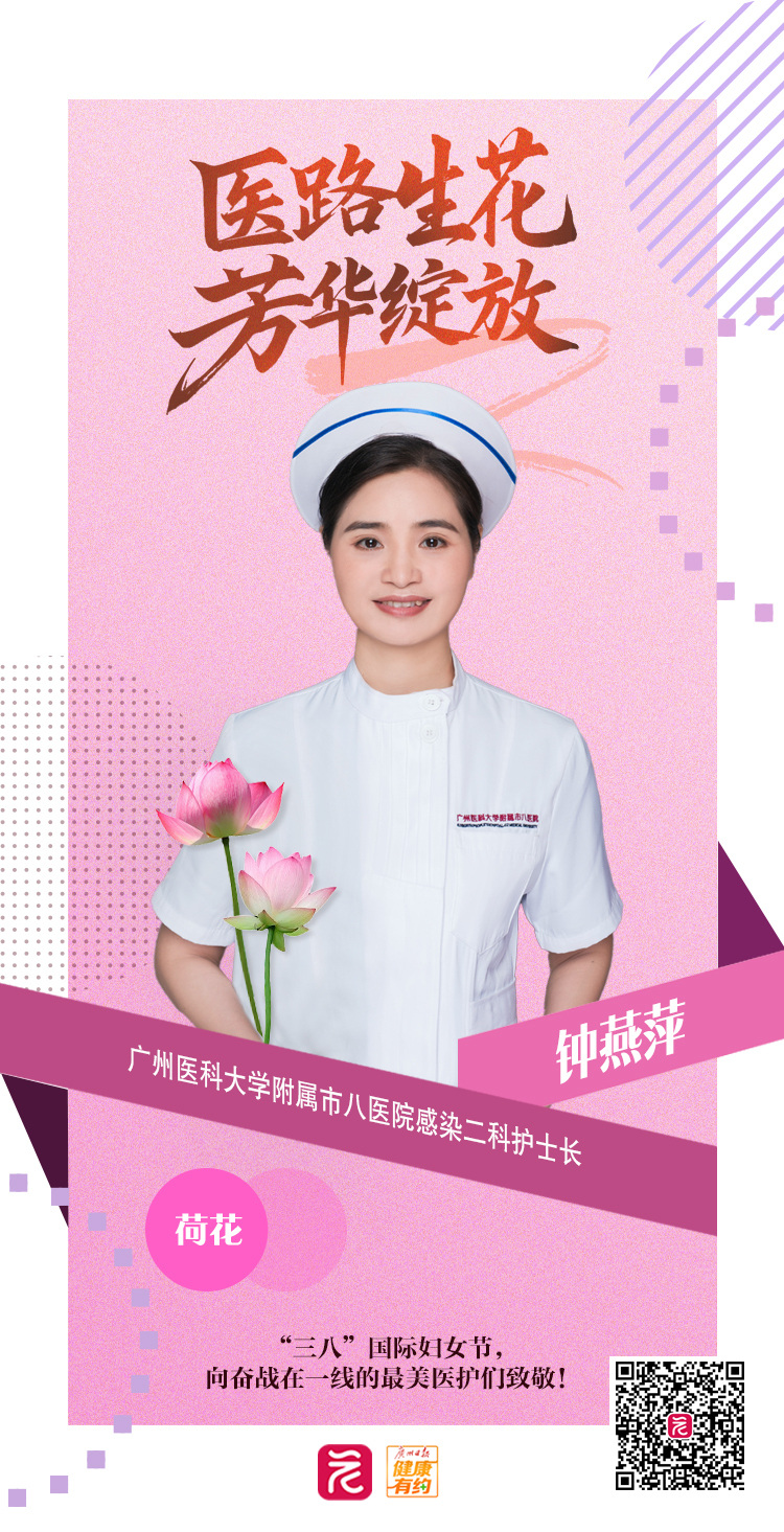 钟燕萍,广州医科大学附属市八医院感染二科护士长,是一名有着24年党龄的老党员。在感染科工作的二十余年,恰似荷花的生命轨迹——在各种传染病疫情的“淤泥”中深深扎根,用清白之心守护生命,以纯洁之爱化解疾苦,凭坚贞之志扛起千钧重担。