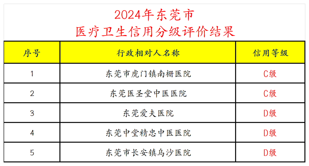 一年之后的2024年2月,东莞市卫生健康局又对外公布“2023年全市医疗卫生信用分级评价结果”,对110家一级及以上医院的信用评级中,30家医院被评为A级,72家获评B级,7家为C级,1家为D级。