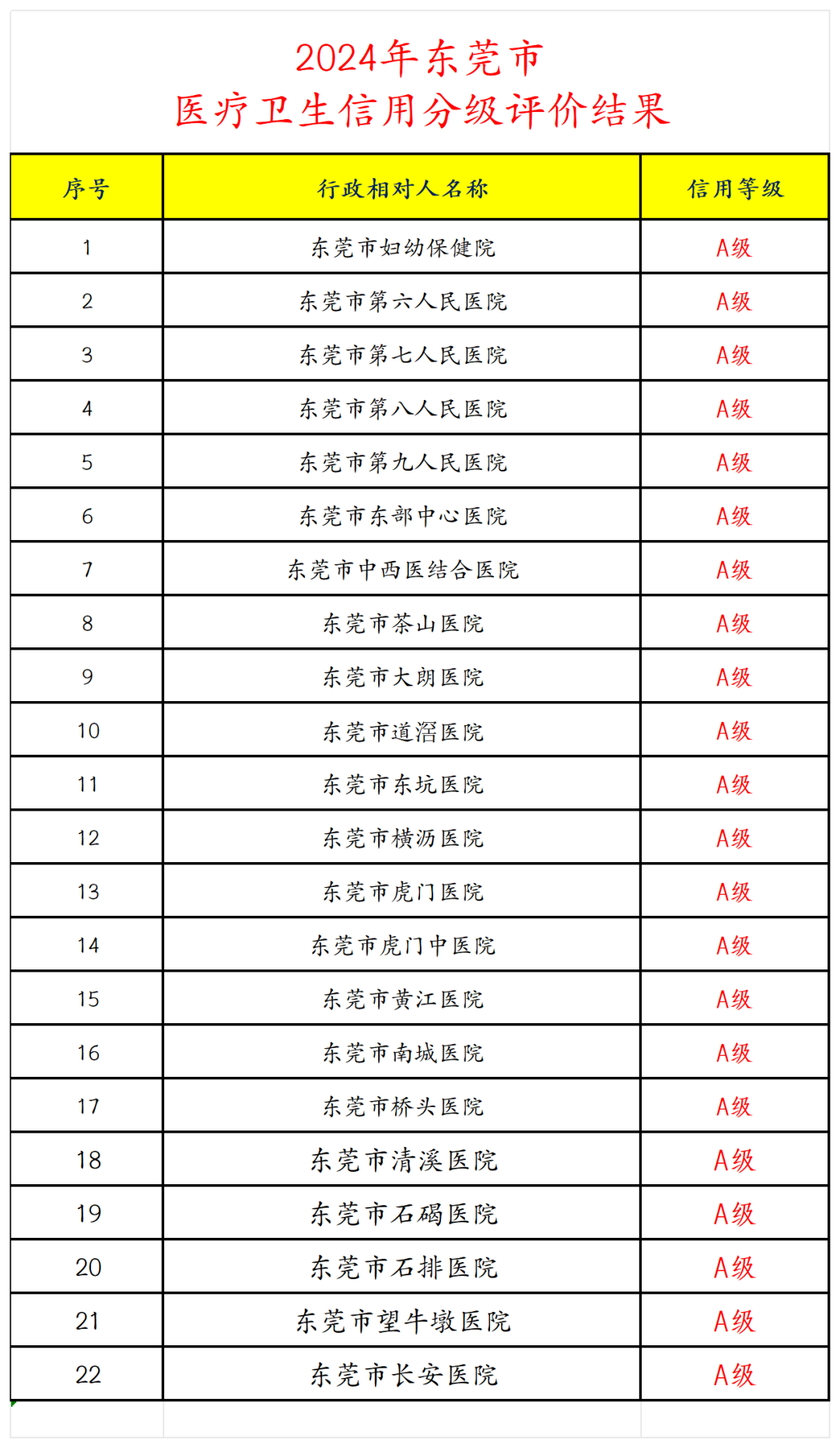 值得一提的是,东莞市第八人民医院、东莞市中西医结合医院、茶山医院、道滘医院、黄江医院、望牛墩医院、长安医院是第一次获评“A级”,展现出这些医院对医疗质量和患者满意度的重视。