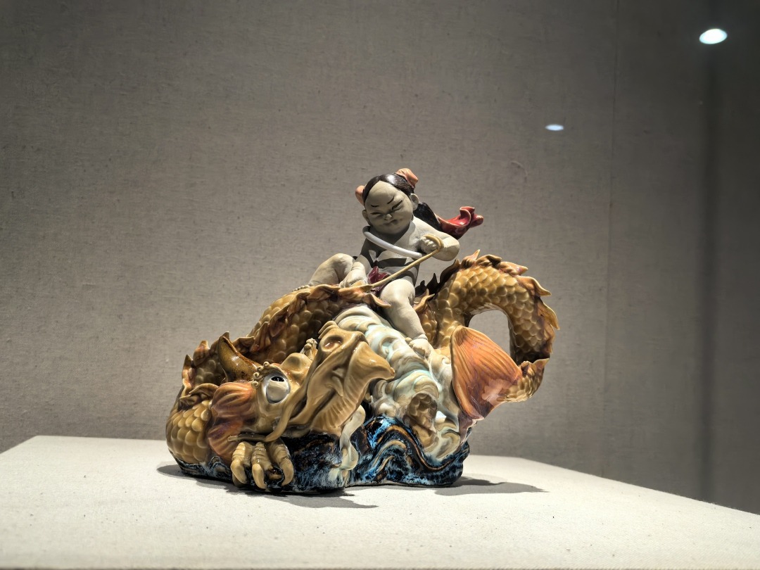 刘藕生五十余载的艺术生涯,既是石湾陶艺从民间工艺向当代艺术转型的缩影,也是中国传统文化创造性转化的生动实践。据介绍,本次展览展出刘藕生大师各时期创作的陶艺作品约70件(套),涵盖陶塑人物、动物及少量绘画作品。展览内容分为四大板块,全面呈现其从写实到写意、从传统到创新的艺术轨迹。刘藕生早期陶艺作品以写实风格为主,以传统陶塑技法为基础,在造型、釉色、人物衣纹处理上充分展现了其对传统陶塑技法的精湛掌握。如《中华龙》《少林小子》等作品,通过细腻的手法和精准的细节处理,栩栩如生地塑造出人物形象,尽显传统工艺的魅力。自上世纪1979年起,刘藕生开始尝试以大写意手法进行创作,开创了石湾陶塑的新风格。他熟练运用捏塑技法,以神话与文人墨客题材为灵感,其作品如《大司命》《苏东坡》等,通过独特的造型与多变的釉色,营造出空灵的艺术意境,诠释了“因意成象,以象立意”的创作理念。