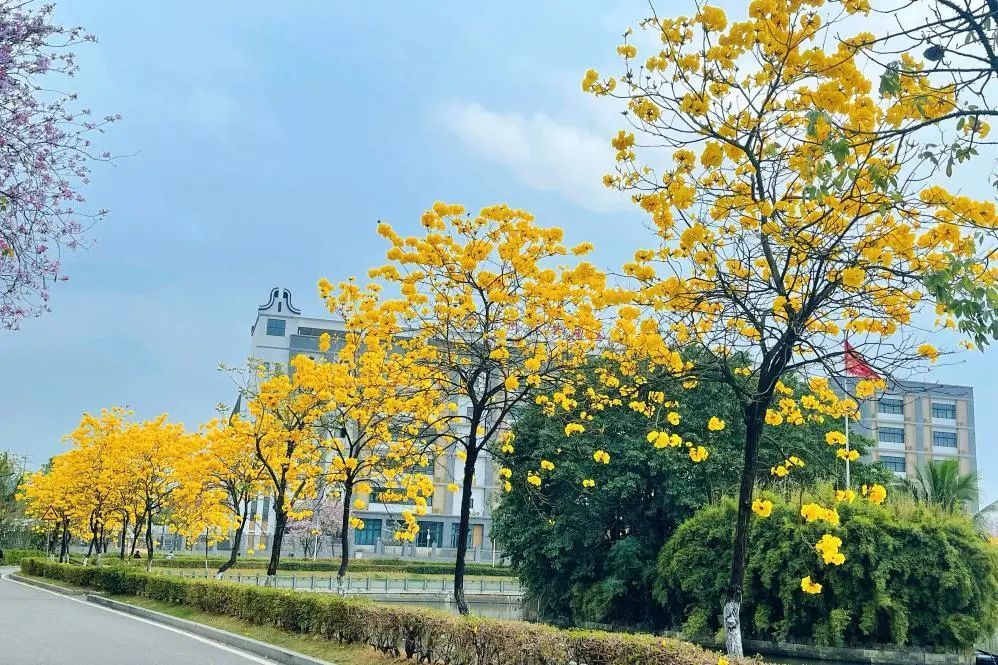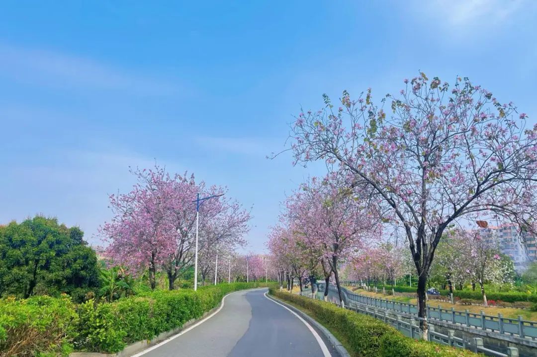 三月的风掠过夏园湖街,宫粉紫荆如云似雾,与黄花风铃的鎏金、异木棉的绯红交叠晕染,绵延2.2公里的道路恍若打翻调色盘,花瓣簌簌落在道路上,镶上了流动的蕾丝花边。