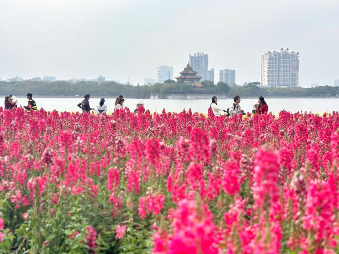 沿着珠江,搭乘海珠有轨电车1号线,穿越浪漫花海,随后前往琶洲岭南东方酒店,从高处欣赏花海,黄花风铃木、紫荆花、樱花、油菜花分布在附近的磨碟沙及海珠湿地公园。