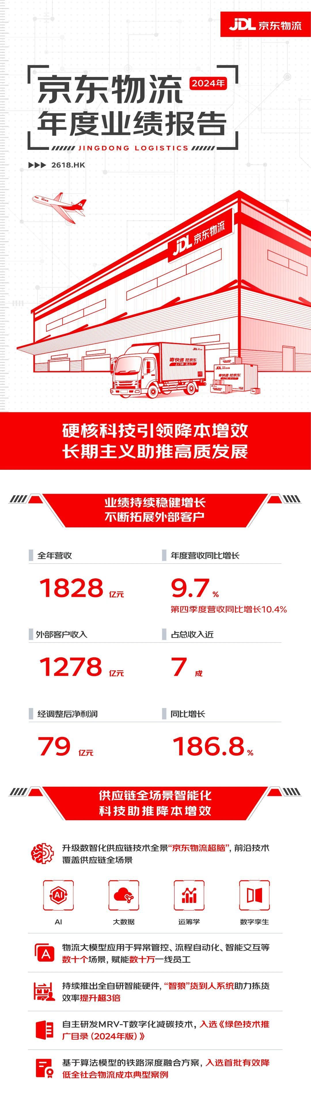 3月6日,京东物流股份有限公司发布2024年年度业绩报告。2024年,京东物流营收达1828亿元,同比增长9.7%,全年经调整后净利润达到79亿元,同比增长186.8%。其中第四季度营收达521亿元,同比增长10.4%。其中,2024年来自外部客户的收入为1278亿元,同比增长9.6%,占总收入比近7成,已服务外部一体化供应链客户超8万家。